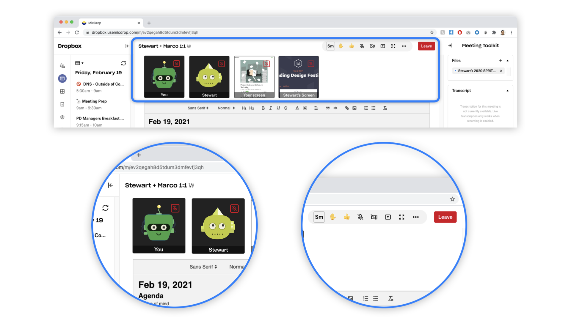I led the vision and design of MicDrop: a unified virtual collaboration platform that combines meetings, real-time co-authoring, and content management into a single, intuitive experience. Under my direction, we moved from concept to alpha in just six months, securing active use by over 2,000 Dropbox employees and 60 external teams. I established data-driven feedback loops, including meeting transcription and engagement metrics, to inform each iteration and drive an increase in user engagement and retention.
