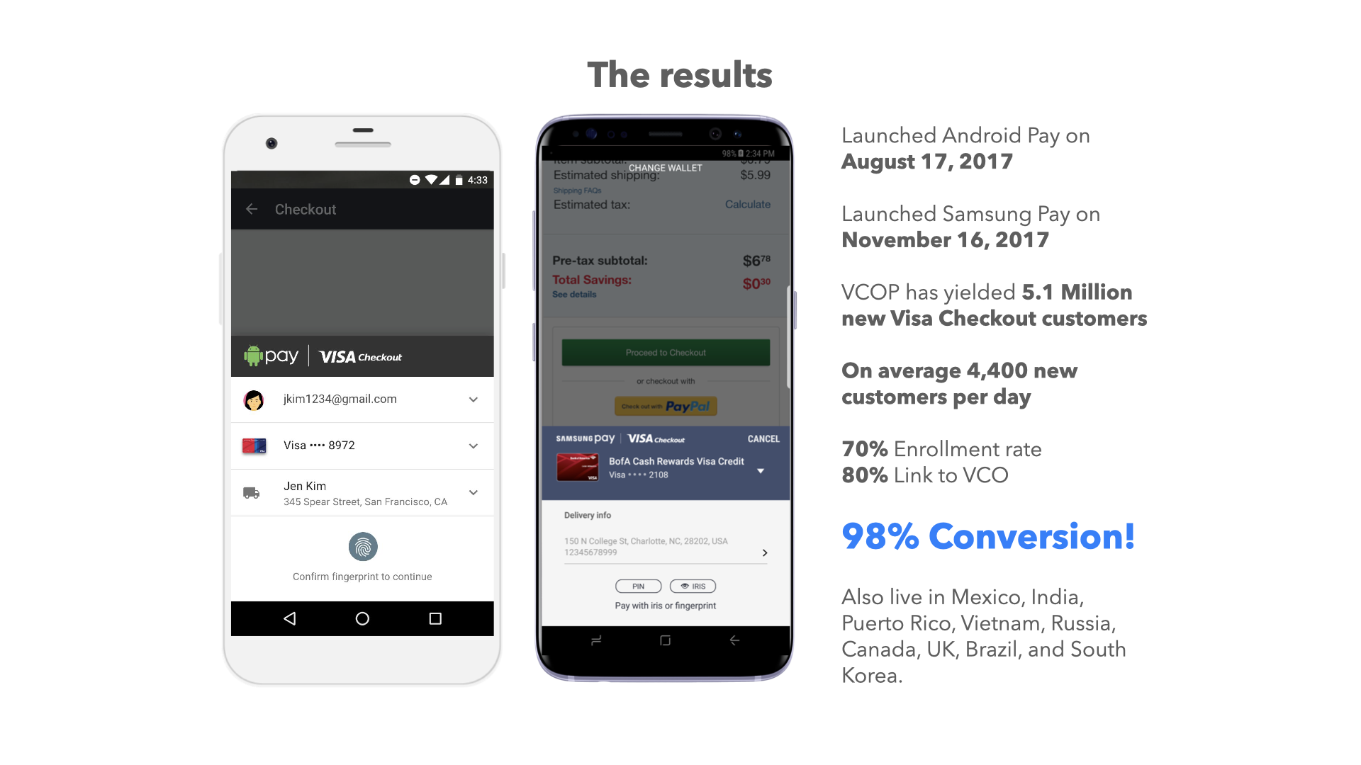 Our enhancements drove over 5.1 million new customers, achieved a 70% enrollment rate and a 98% conversion rate across 26 countries, significantly boosting global reach and merchant enablement.